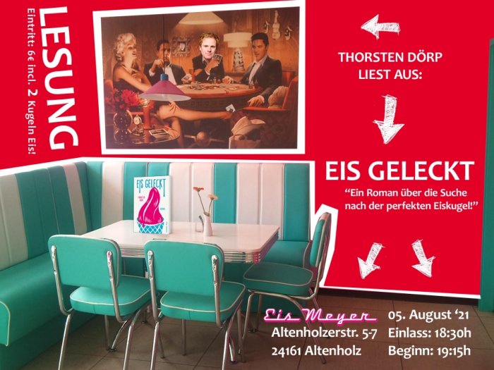 Hunderte, ach was zig tausende Filme sind über diesen Ort gedreht worden. Unzählige Bücher verfasst. Gedichte, Lieder, Tätowierungen - was weiß ich ... Nun folgt die einzig logische Schlussfolgerung: Es wird auch noch eine Lesung geben. Im August. Und wie könnte es anders sein? In DER Eisdiele überhaupt - bei Eis Meyer! Dieser Ort wird am 05. August die Pilgerstätte für die schönsten Menschen dieser Erde: Um Reservierungen wird deshalb gebeten.