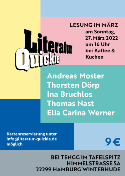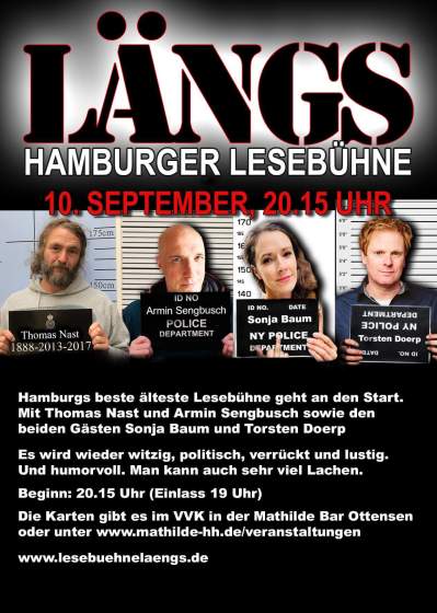 Last but not least möchte ich noch für einen Auftritt bei Hamburgs ältester Lesebühne werben. In der Mathilde-Bar in Hamburg Ottensen, am 10.09.2022: Armin Sengbusch, Thomas Nast, Sonja Baum und ich treffen aufeinander. Die einen bringen Schnaps mit, die anderen Buchstaben, doch auf jeden Fall gute Laune! Mal sehen, doch vor allem hören, was da herauskommen wird. Ich freue mich ...