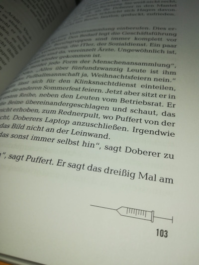 Ein Krankenhausroman … liest man auf dem wunderschön illustriertem Hard-Cover (Buntstift, viel Orange, viele Striche, ein Arzt mit Kittel, hübsch hübsch). Doch worum geht es in der Geschichte? Um Professor Dr. Brinkmann auf jeden Fall schon mal nicht. Auch nicht um den Schwarzwald. Dafür um den Geschäftsführer der Dubio-Klinik Hans-Jürgen Doberer und den Assistenzarzt Hagen Burbeis (der schöne Hagen), der in Punzlau seine neue Stelle antritt. Ja, und um zentrale Fragen wie Krankheit, Macht, Betrug und Sexualität.