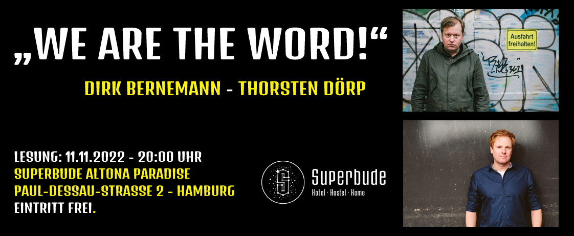 Unter dem Motto "We are the Word!" treffen wir uns alle in der Superbude Hamburg Altona Paradise. Ab 19:30 Uhr gibt es das ertse Bier und um 20 Uhr geht's dann los.
