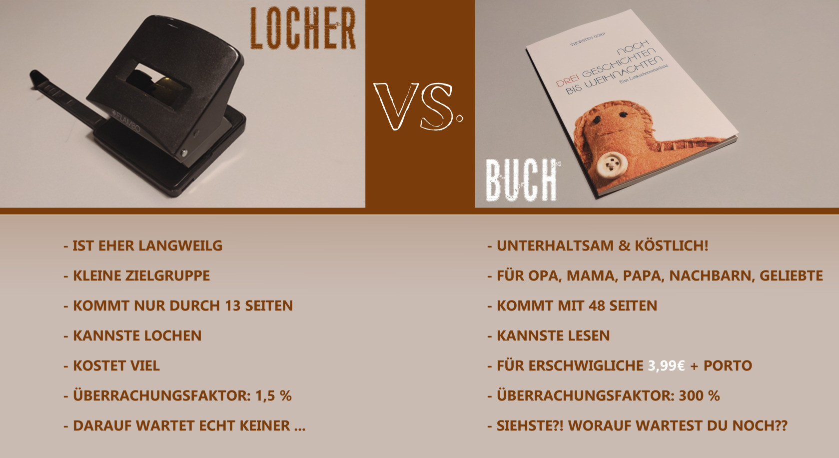 Und dann gibt es eine vorweihnachtliche Geschenkaktion: Ab dem 16. November wird es meinen Weihnachtsklassiker „Noch drei Geschichten bis Weihnachten“ für zwei Wochen kostenlos als E-Book geben. Also verschenkt es gerne weiter und erzählt allen Freunden davon!