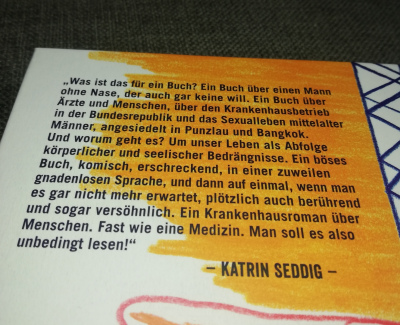 Ein Krankenhausroman … liest man auf dem wunderschön illustriertem Hard-Cover (Buntstift, viel Orange, viele Striche, ein Arzt mit Kittel, hübsch hübsch). Doch worum geht es in der Geschichte? Um Professor Dr. Brinkmann auf jeden Fall schon mal nicht. Auch nicht um den Schwarzwald. Dafür um den Geschäftsführer der Dubio-Klinik Hans-Jürgen Doberer und den Assistenzarzt Hagen Burbeis (der schöne Hagen), der in Punzlau seine neue Stelle antritt. Ja, und um zentrale Fragen wie Krankheit, Macht, Betrug und Sexualität.